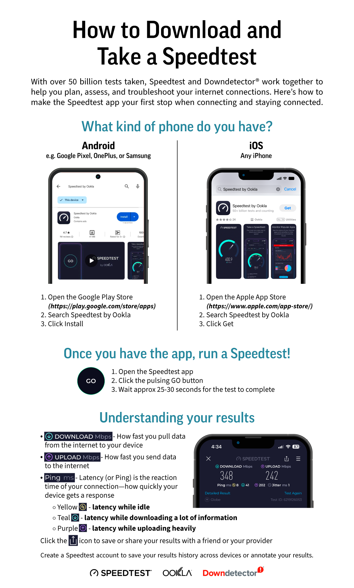 Plan for your best internet experiences with Speedtest. Download the free app for iOS or Android to prepare for your next adventure. And to learn how to download the app and take a Speedtest, check out our infographic below!